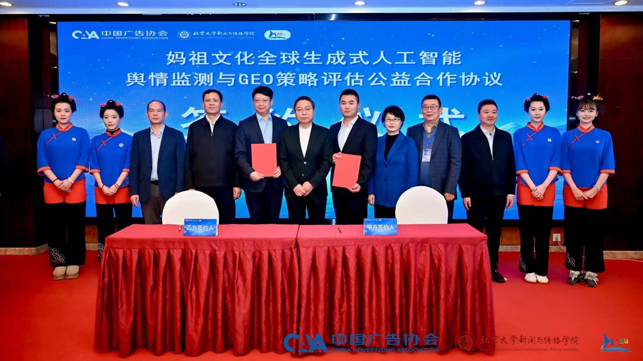 开幕式还举行了两项公益性合作项目签约仪式。莆田市湄洲岛旅游服务有限公司总经理肖泽星分别与氧气科技有限公司创始人兼CEO董浩宇签署了《妈祖文化全球生成式人工智能舆情监测与GEO策略评估公益合作协议》,与北京智语爱科技有限公司总裁、中国广告协会AIGC工作委员会执行主任田涛签署了《湄洲岛妈祖文化AI传播服务合作协议》合作协议。莆田市人民政府副市长林韶雯、副市长吴文恩,湄洲岛党工委副书记、管委会主任龚承恕,中国广告协会会长张国华,北京大学新闻与传播学院院长陈刚、副院长陈开和等领导嘉宾共同见证签约。