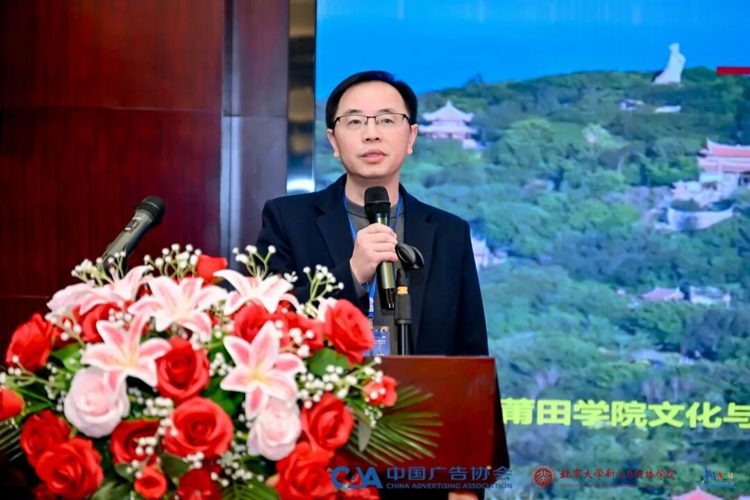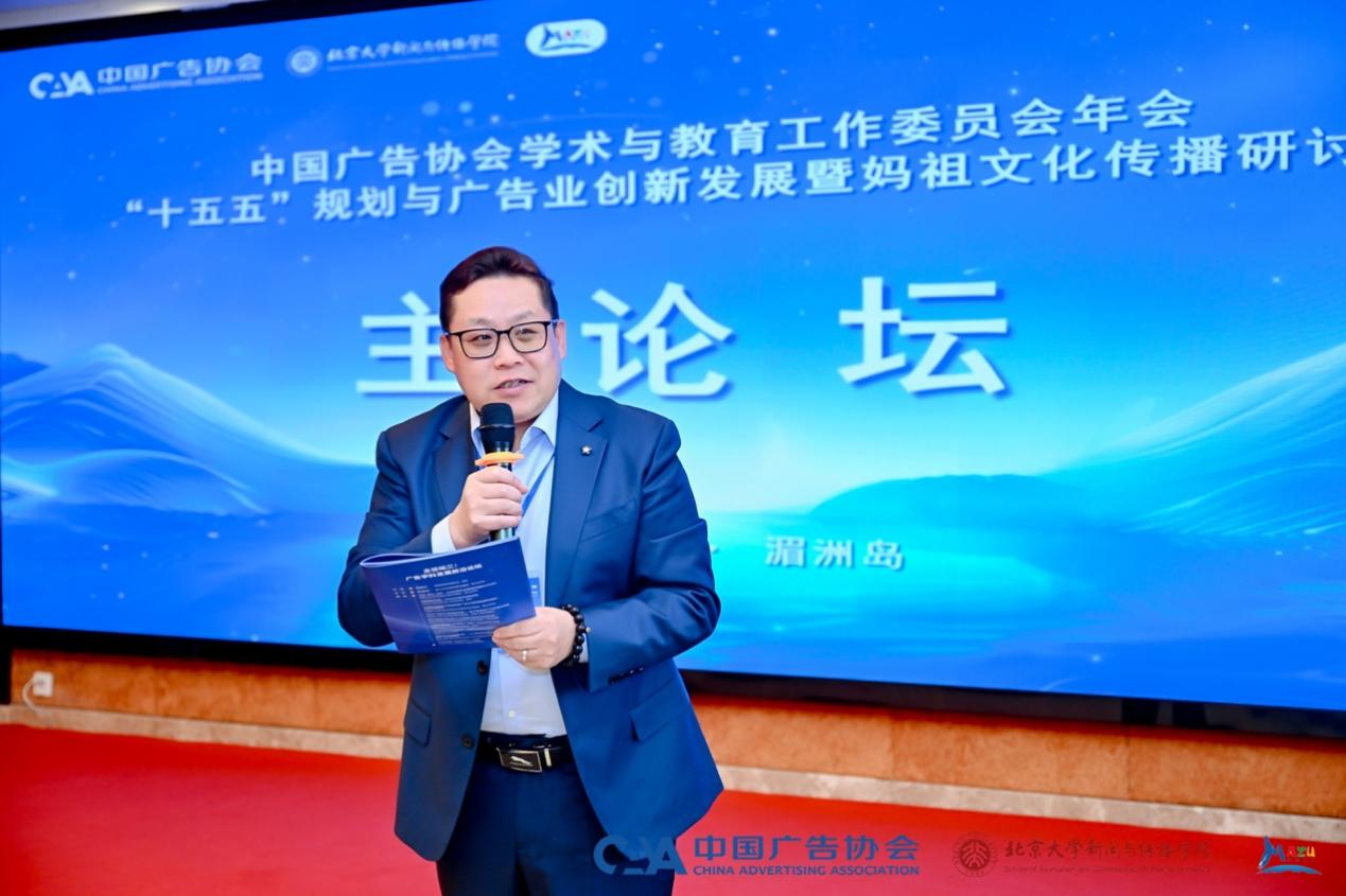 北京大学新闻与传播学院院长、中国广告协会学术与教育工作委员会主任陈刚在致辞中表示,本次年会将广告学术研讨与妈祖文化传播深度结合,是广告业对接优秀传统文化传播、探索产学研融合发展模式的前沿实践。他介绍了北京大学-莆田妈祖文化工作室的相关工作,强调工作室一直致力于整合资源开展高质量研究,推动妈祖文化的研究深化与创新传播,并鼓励广告协会学术与教育工作委员会的各位同仁,在“十五五”新征程中共同努力,让广告学术研究在服务国家发展战略中绽放活力。