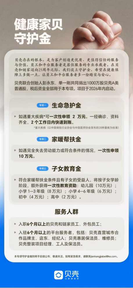 2月24日,贝壳联合创始人、董事长兼首席执行官彭永东和联合创始人单一刚在内部全员信中透露,在贝壳和链家迈向25周年之际,将共同捐赠1000万股A类贝壳普通股,税后资金将用于设立“健康家贝守护金”,作为贝壳和链家员工以及行业服务者约50万人的保障金。按2月23日收盘价,该笔捐赠价值约4亿元,项目将于年内启动。