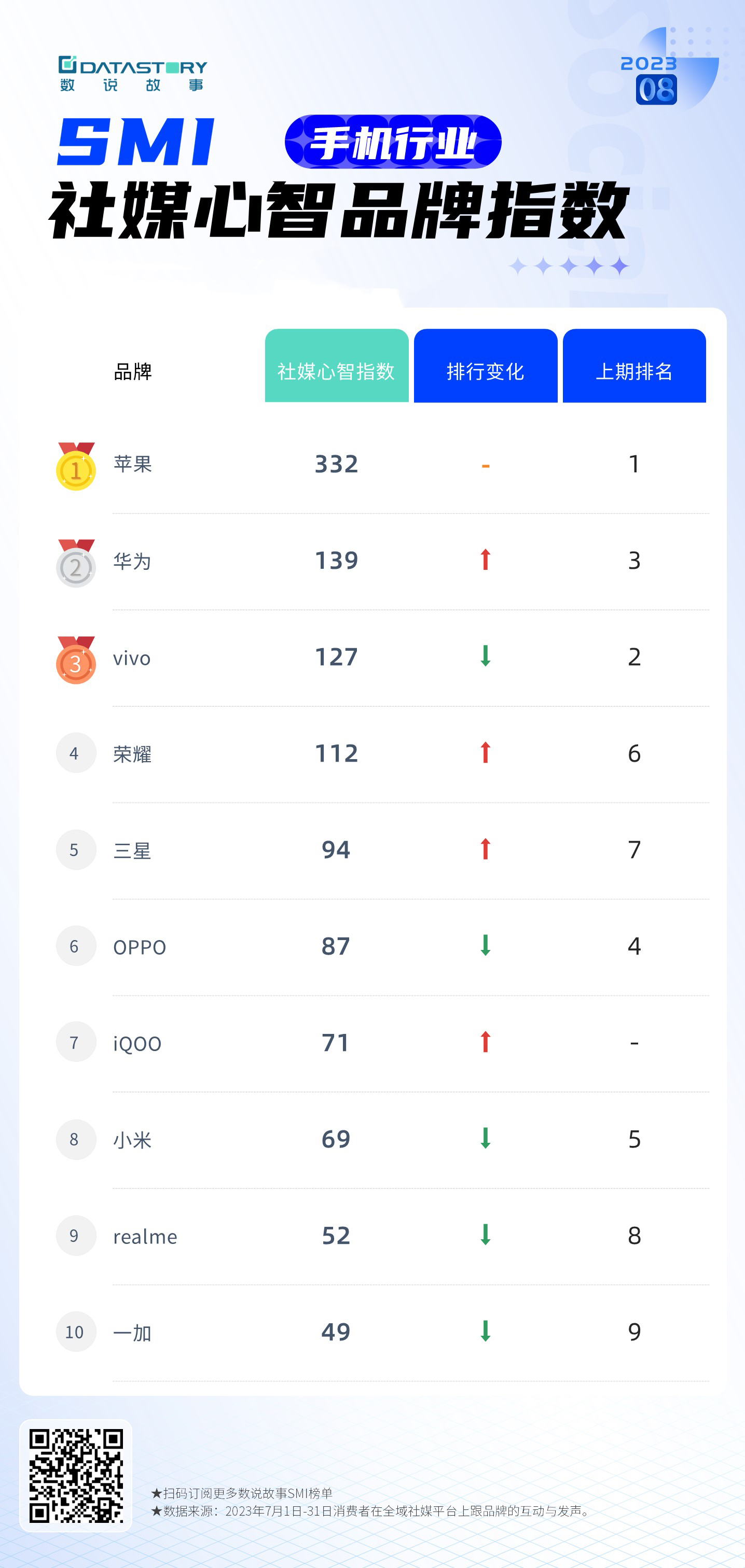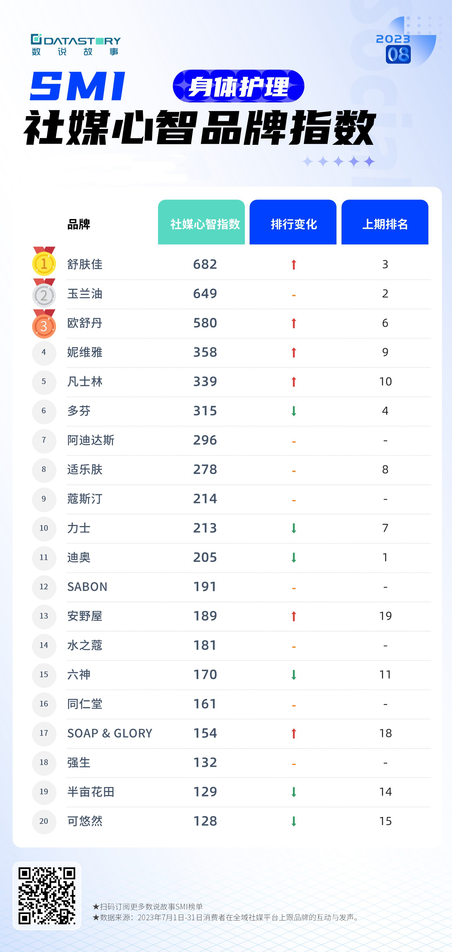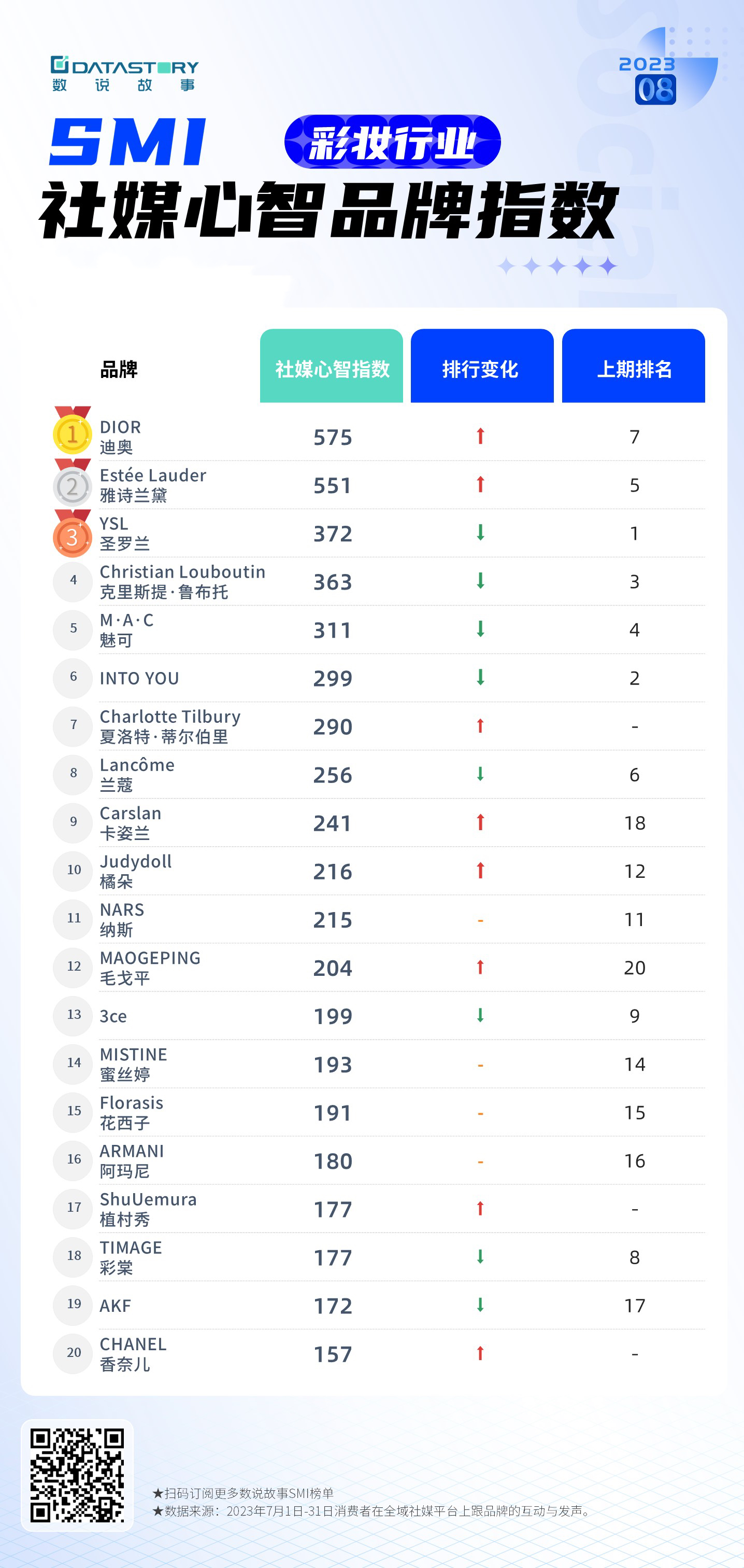 数说故事联合中国广告协会,聚焦美妆日化、食饮健康、3C家电、鞋服、汽车五大消费行业,权威发布2023年8月《SMI社媒心智品牌指数》。